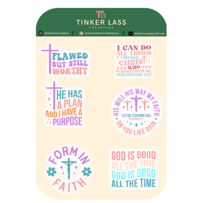 Each sticker encapsulates a unique message of hope, love, and spiritual strength, designed to uplift and resonate with your beliefs. From elegant cross designs to powerful scripture verses, adorn your belongings with these stickers to carry a piece of your faith wherever you go. Perfect for laptops, water bottles, notebooks, and more.